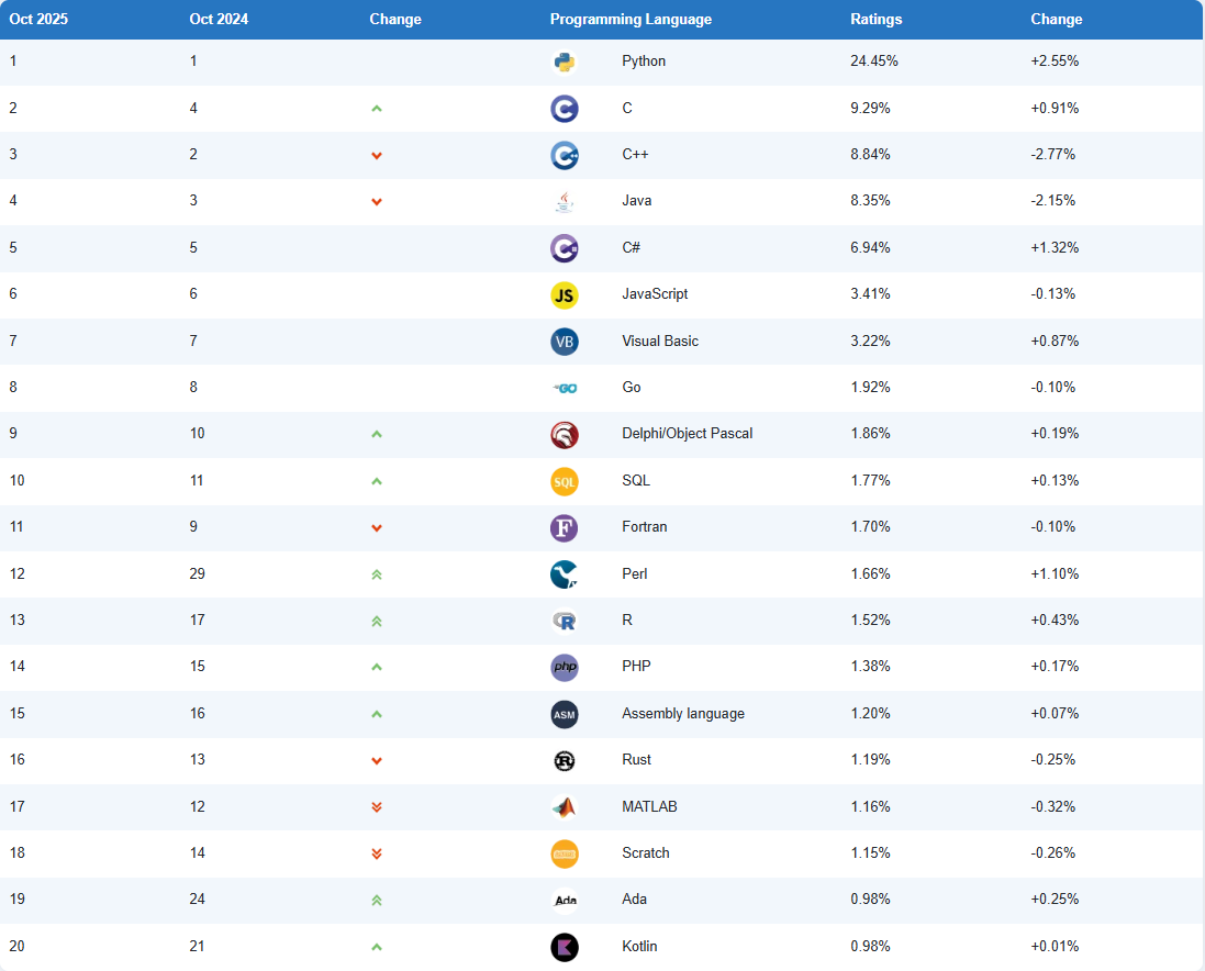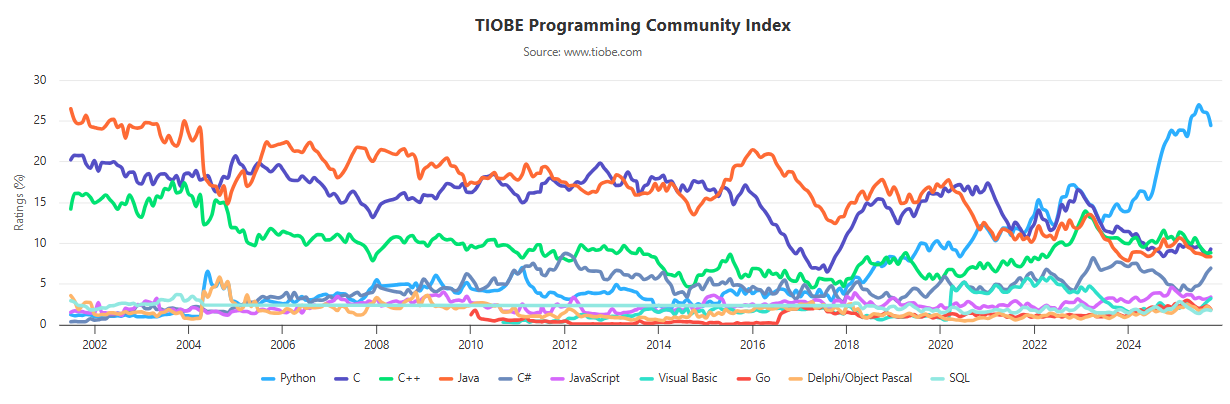 在 2025 年 10 月 TIOBE 編程語(yǔ)言排行榜中,Python 以 24.45% 的占比穩(wěn)居第一,C 語(yǔ)言以 9.29% 的占比緊隨其后,兩者競(jìng)爭(zhēng)激烈。