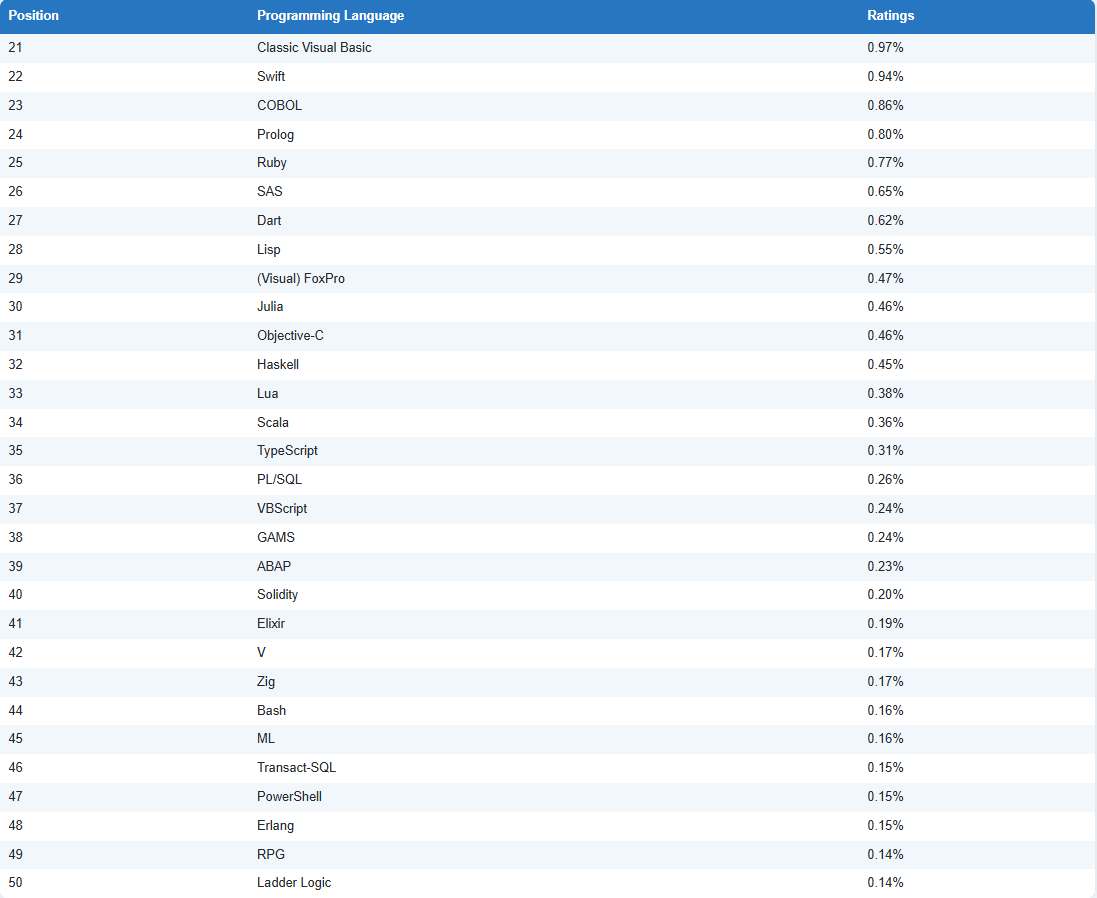 7 | Visual Basic | 3.22% | +0.87% | 舊系統(tǒng)維護(hù)/Office腳本 |