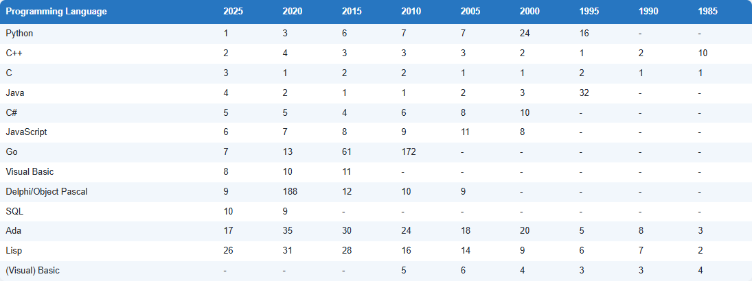 - Python 一路高歌猛進(jìn),從十年前的第 7 名到如今穩(wěn)居榜首,AI 與數(shù)據(jù)時(shí)代的寵兒。
