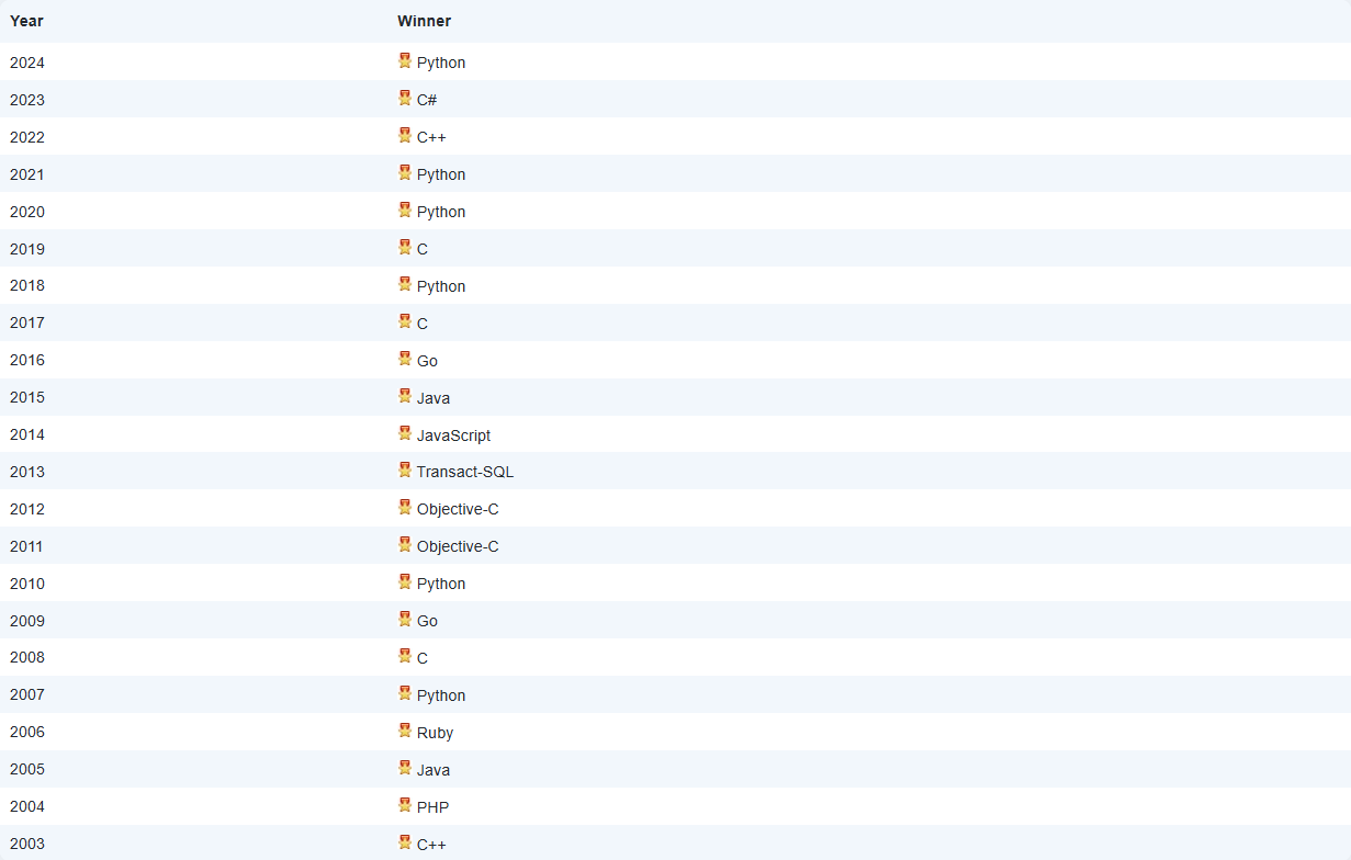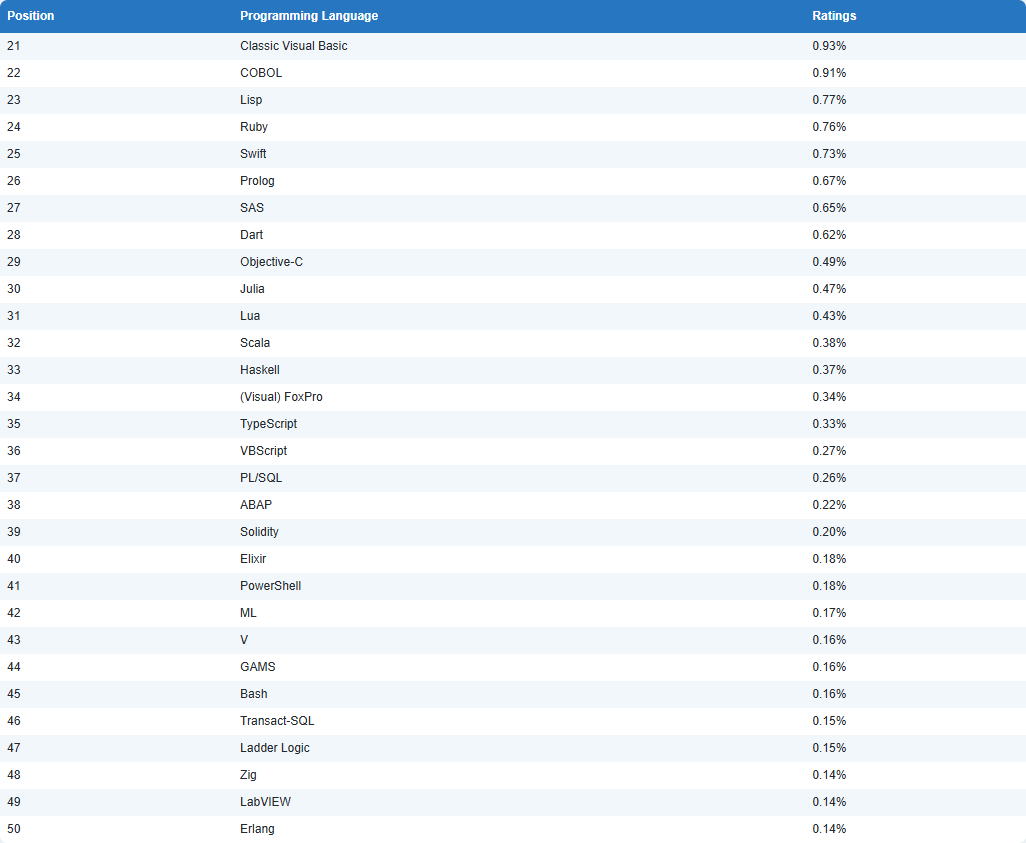 7 | Visual Basic | 2.84% | +0.14% | 老舊系統(tǒng)維護(hù),.NET入門可選。 |